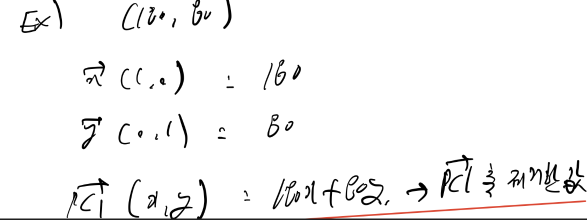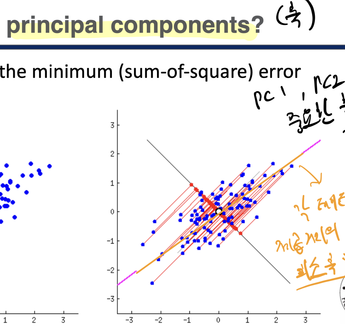 실질적으로 principal component(축)을 찾는 방법은 직교하는 나머지 값 제곱거리가 최소가 되는 축을 찾는다..