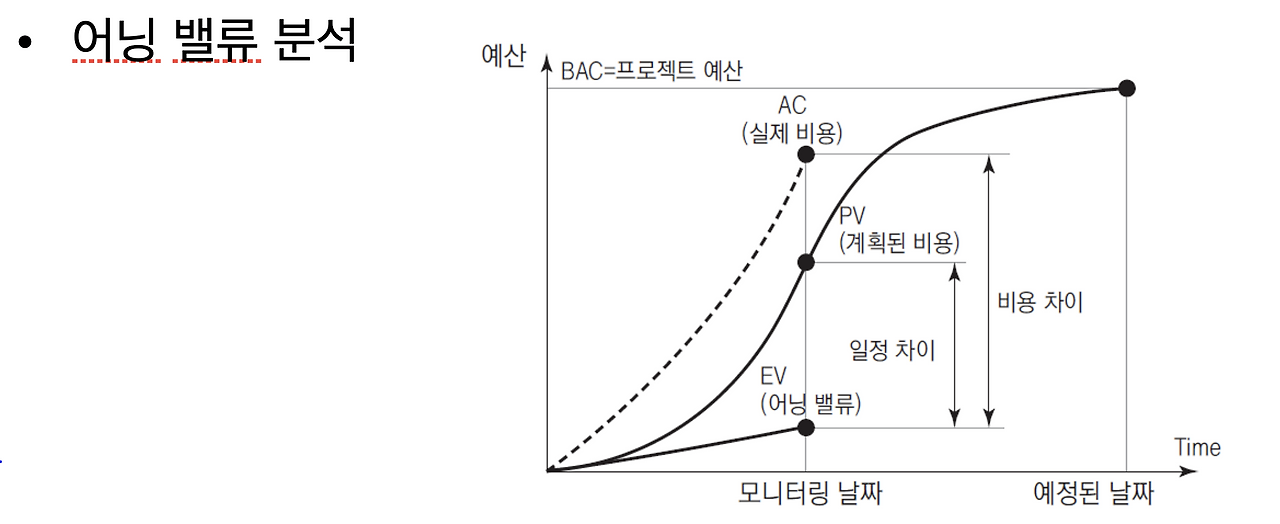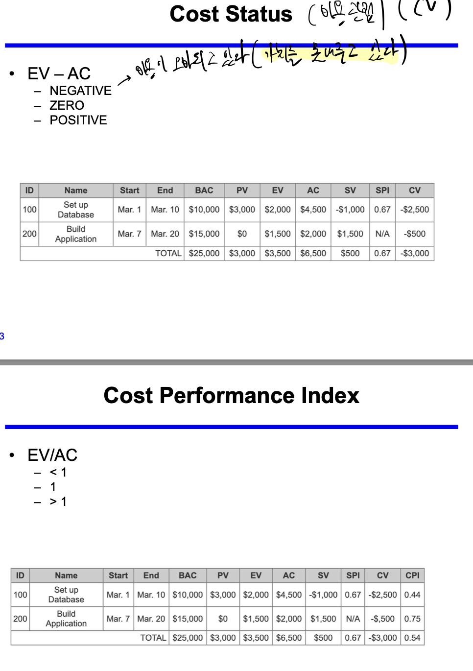 EV - AC, 음수라면 계획보다 비용이 초과되고 있는 상황 (가치를 못내주고 있다고 해석가능)