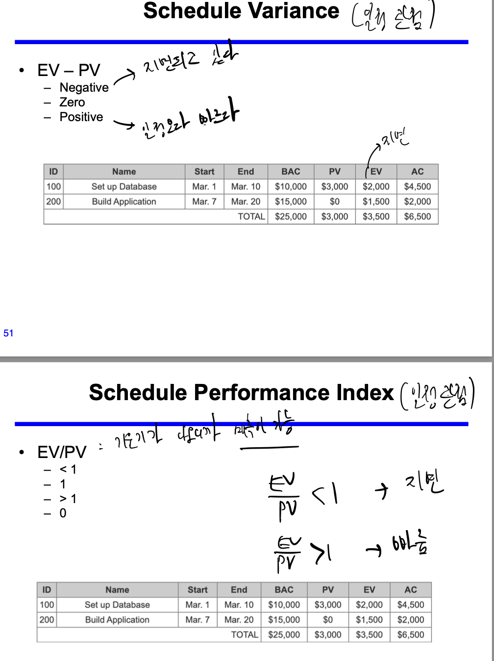 일정 관점에서 현재 상황을 정리한다 - SV = EV - PV, SPI = EV / PV