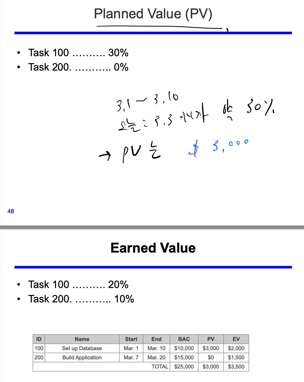 PV (Planned Value) : 지금까지 완료했어야 하는 가치