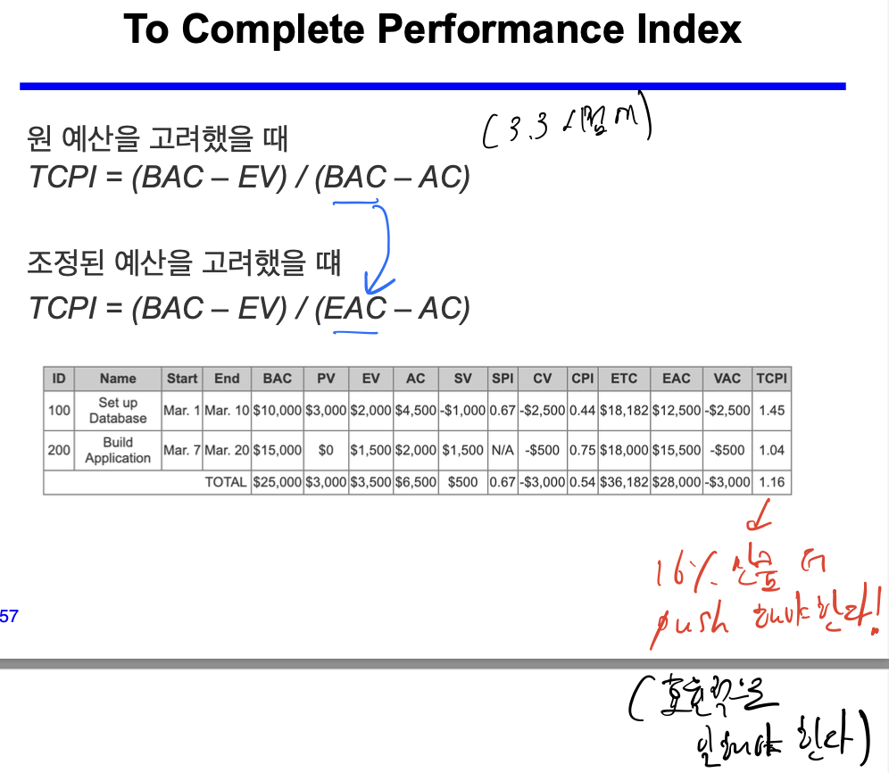 TCPI (To Complete Performance Index) : 프로젝트가 끝날때까지 예상되는 총 비용과 예산의 차이를 고려한 성과 지수