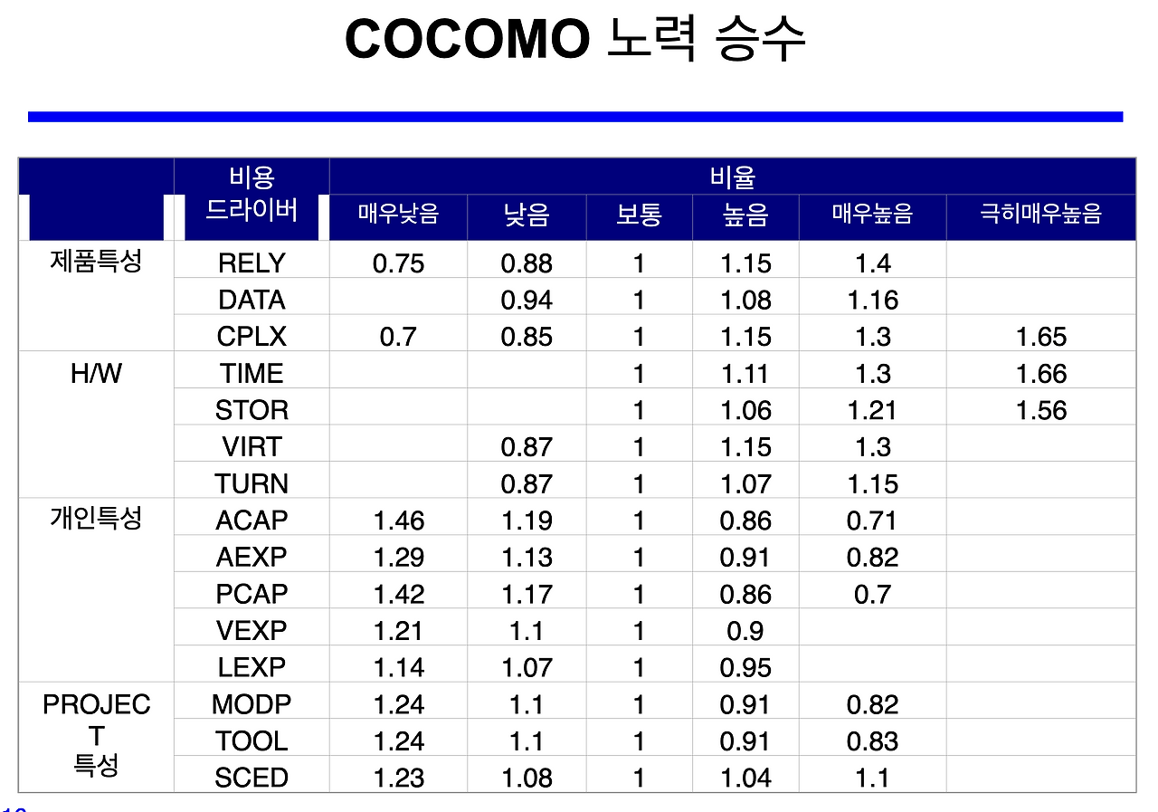 표에서 볼 수 있듯이 규모가 커질수록, 복잡한 시스템일수록 2.4, 3.0, 3.6으로 계수가 증가하고 차수도 1.05, 1.12, 1.20으로 증가한다.