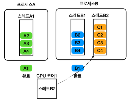 스레드 A를 멈추고 스레드 B를 실행해야 한다.