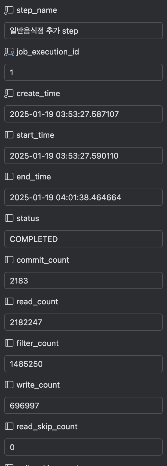 Copy code1,2185,일반음식점 추가 step,1,2025-01-19 03:53:27.587107,2025-01-19 03:53:27.590110,2025-01-19 04:01:38.464664,COMPLETED,2183,2182247,1485250,696997,0,0,0,0,COMPLETED,"",2025-01-19 04:01:38.465663