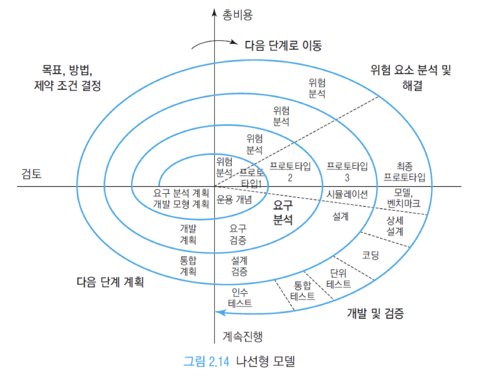 나선형 모델은 완성되지 않은 시스템을 완성형으로 나아가는 방법론이다.