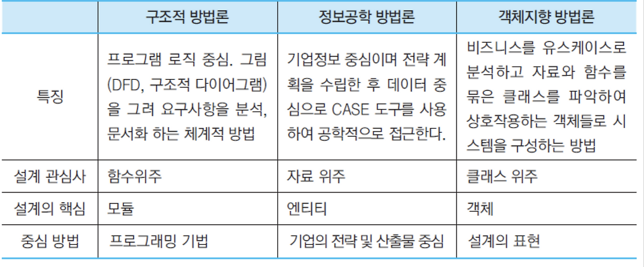 크게 구조적 방법론, 정보공학 방법론, 객체지향 방법론 3가지가 있는데