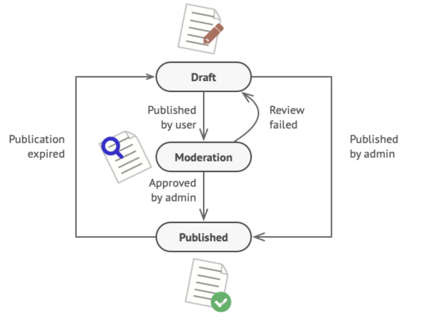 예를 들어, Draft -> Moderation -> Published 상태는 전 단계가 끝나야 진행되는 것이기 때문에